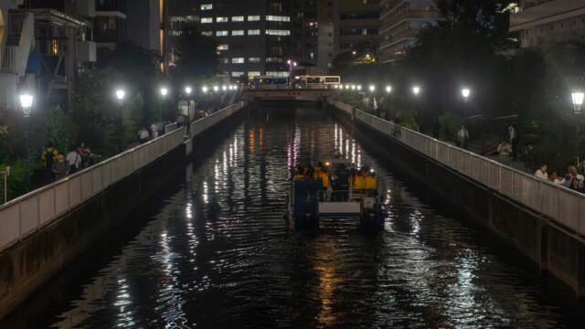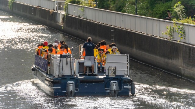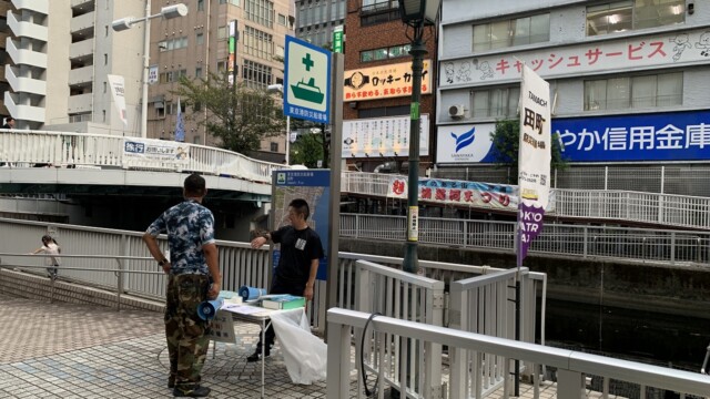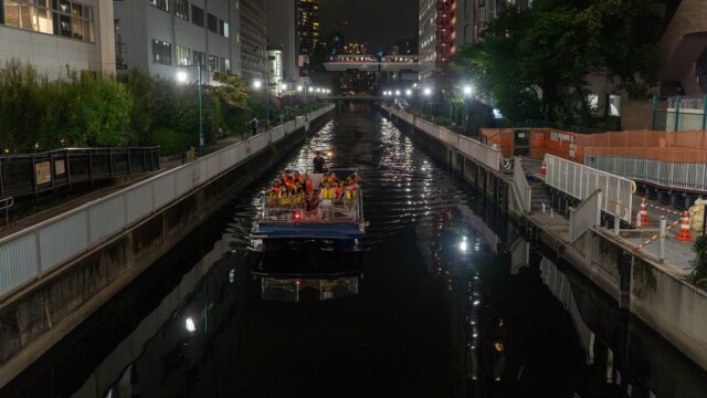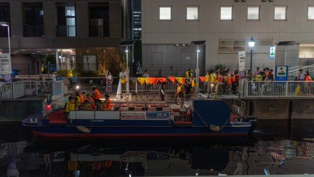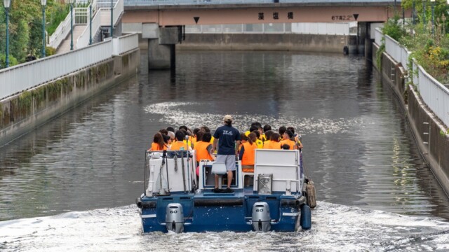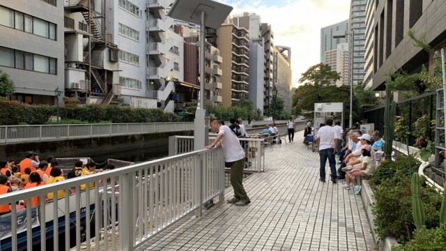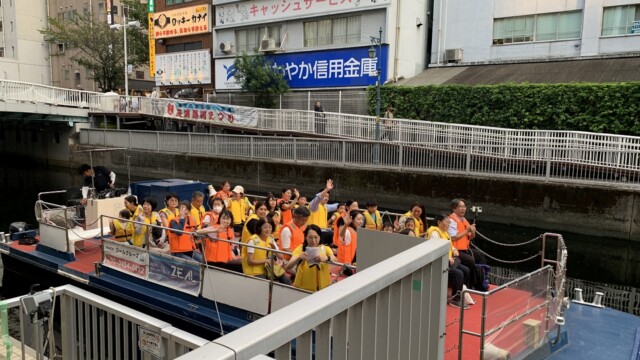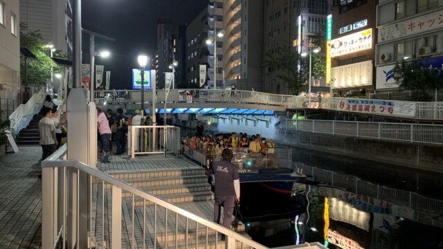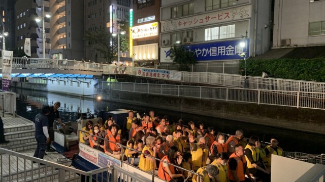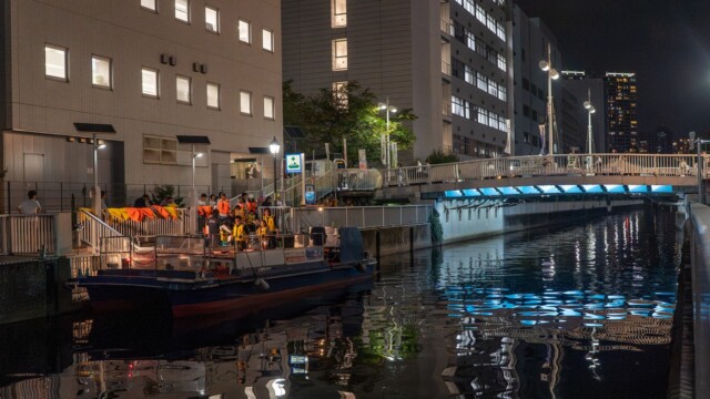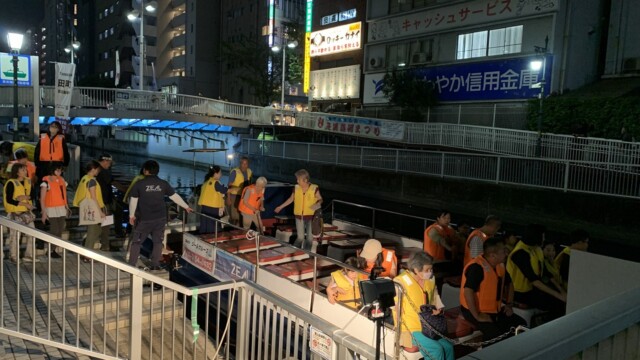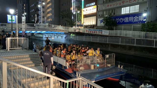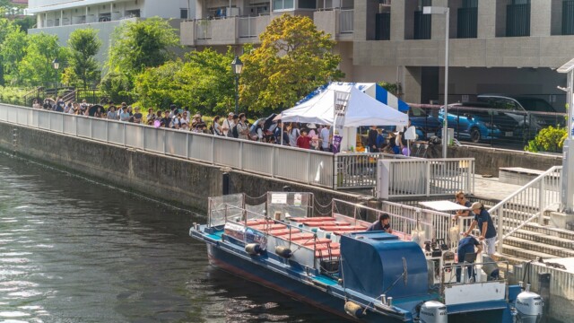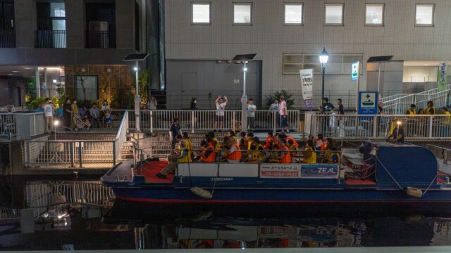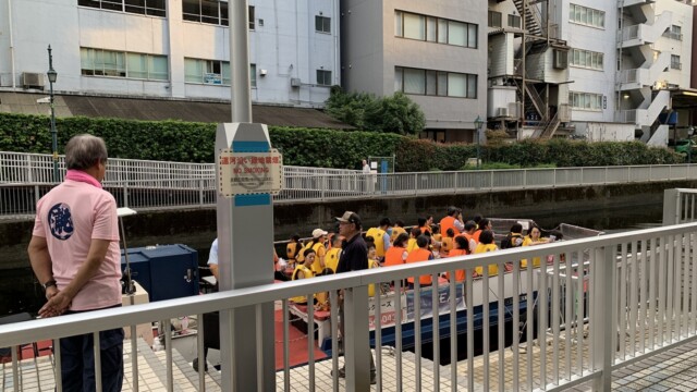 新芝橋下の運河遊歩道防災桟橋から、運河クルーズが出航です。